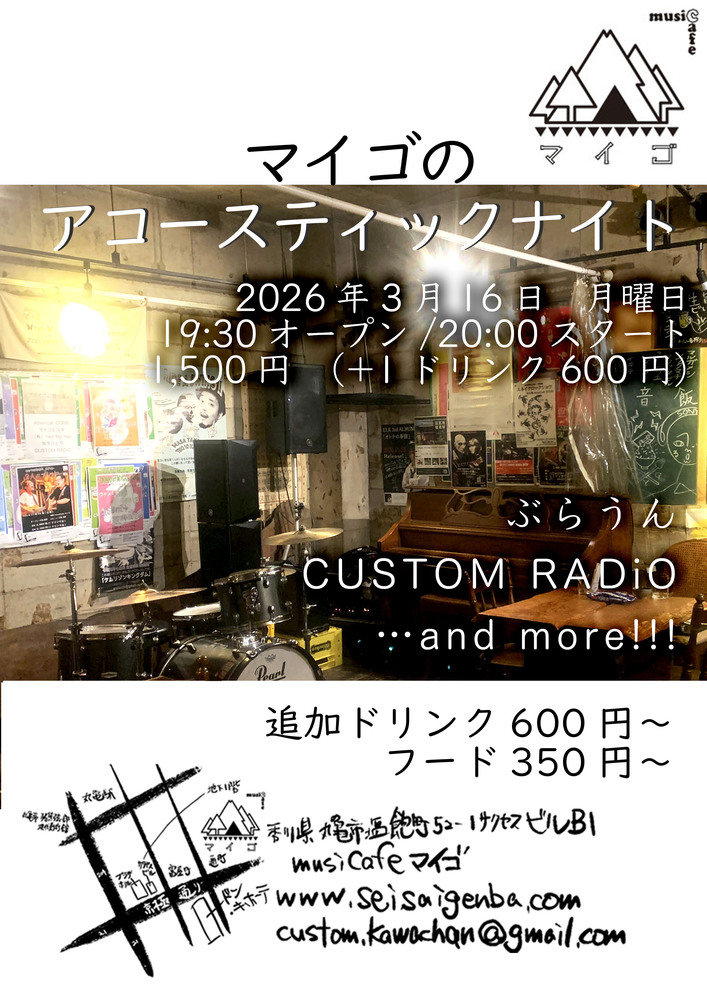 3/16(月)「マイゴのアコースティックナイト」 SCHEDULE / 8 SEATS 2026/03/16(月) 19:30 - 23:00 musiCafeマイゴ 地図を表示 2026年3月16日 月曜日 「マイゴのアコースティックナイト」 19:30 オープン/20:00 スタート 当日 1,500円(+1ドリンク600円) ぶらうん CUSTOM RADiO URLをコピーする 報告する