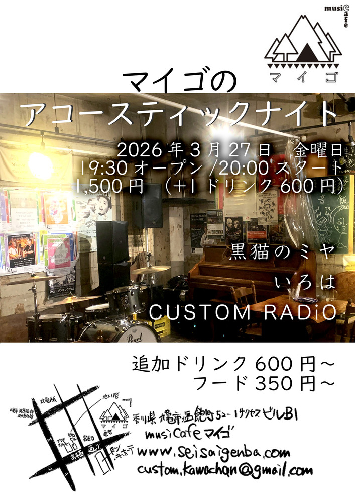 3/27(金)「マイゴのアコースティックナイト」 SCHEDULE / 8 SEATS 2026/03/27(金) 19:30 - 22:30 musiCafeマイゴ 地図を表示 2026年3月27日 金曜日 「マイゴのアコースティックナイト」 19:30オープン/20:00スタート 料金 1,500円(+1ドリンク600円) 追加ドリンク600円〜 フード350円〜 黒猫のミヤ いろは CUSTOM RADiO URLをコピーする 報告する